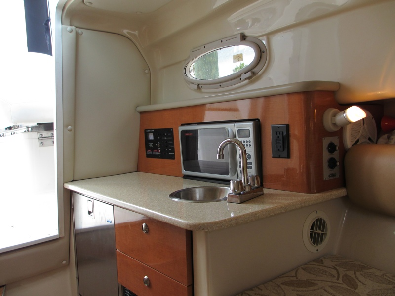 A small cabin houses a refrigerator, fresh water and additional seating.
